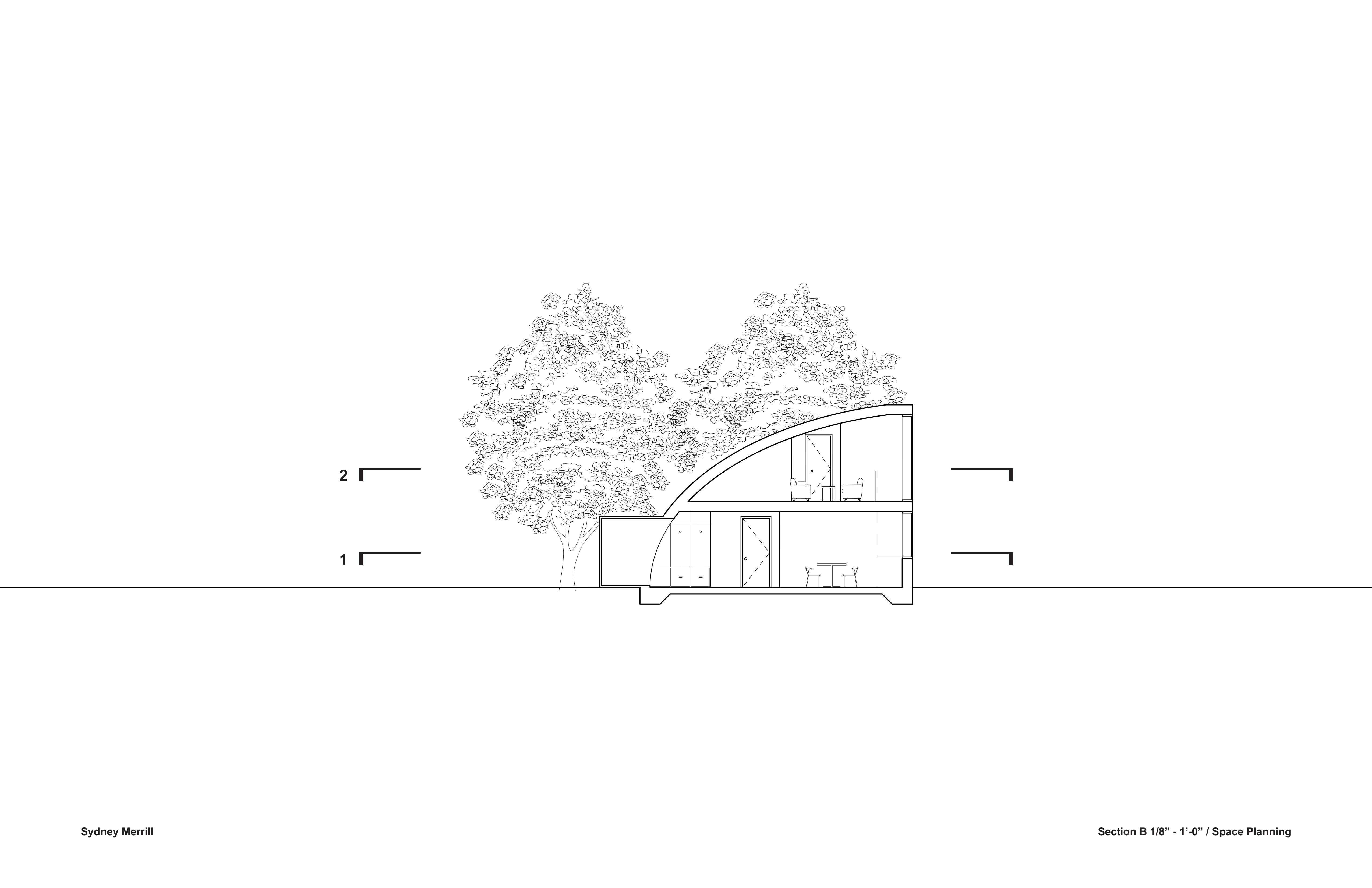 One of the main challenges of this project was taking into account the curved wall when planning the space in the second floor. Due to both regulations and practical concerns, the back half of the second floor was unusable, significantly decreasing the amount of living space. I chose not to cut off the space with a wall so that the curve of the space could still be read from the inside.