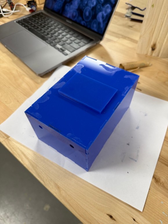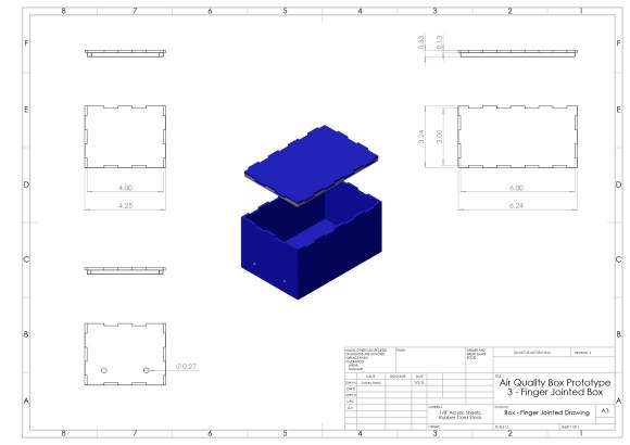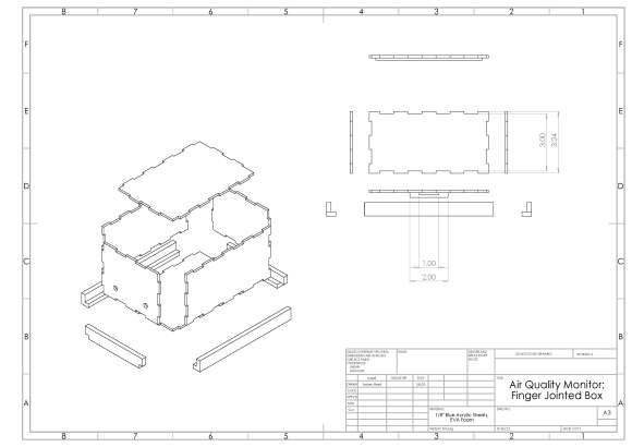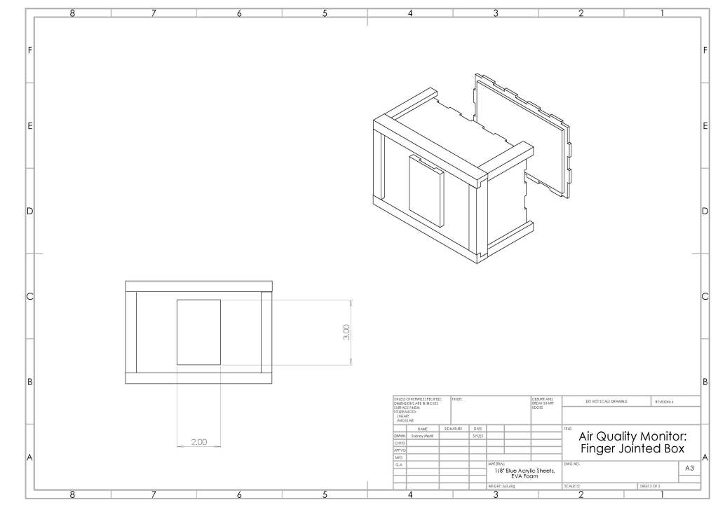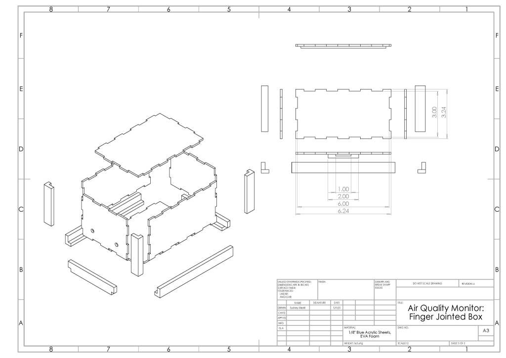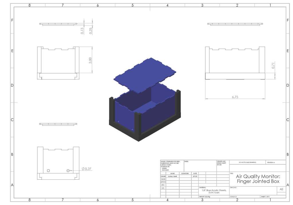 My primary role in this project was CADing. As the team member with the best CAD skills, I created all the digital models and drawings of our box in SolidWorks, as well as the Adobe Illustrator files used to laser cut the acrylic. Sydney Meza was in charge of electronics and coding, including figuring out how to wirelessly upload the data. Olivia and Angela were primarily in charge of physically building the prototype and testing, including drop tests and water tests.