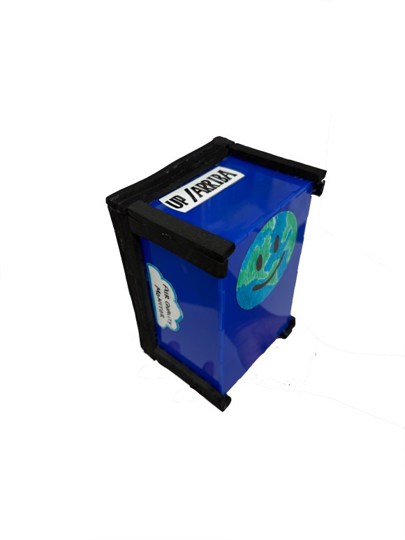 Our final product was a laser-cut acrylic box housing CO, NO2, and PM2.5 sensors. Key features include a rain cover for New England weather, internal and external foam supports, labels in English and Spanish, a velcro strap attachment, a rechargable lithium battery, and cloud based data that is wirelessly uploaded.
