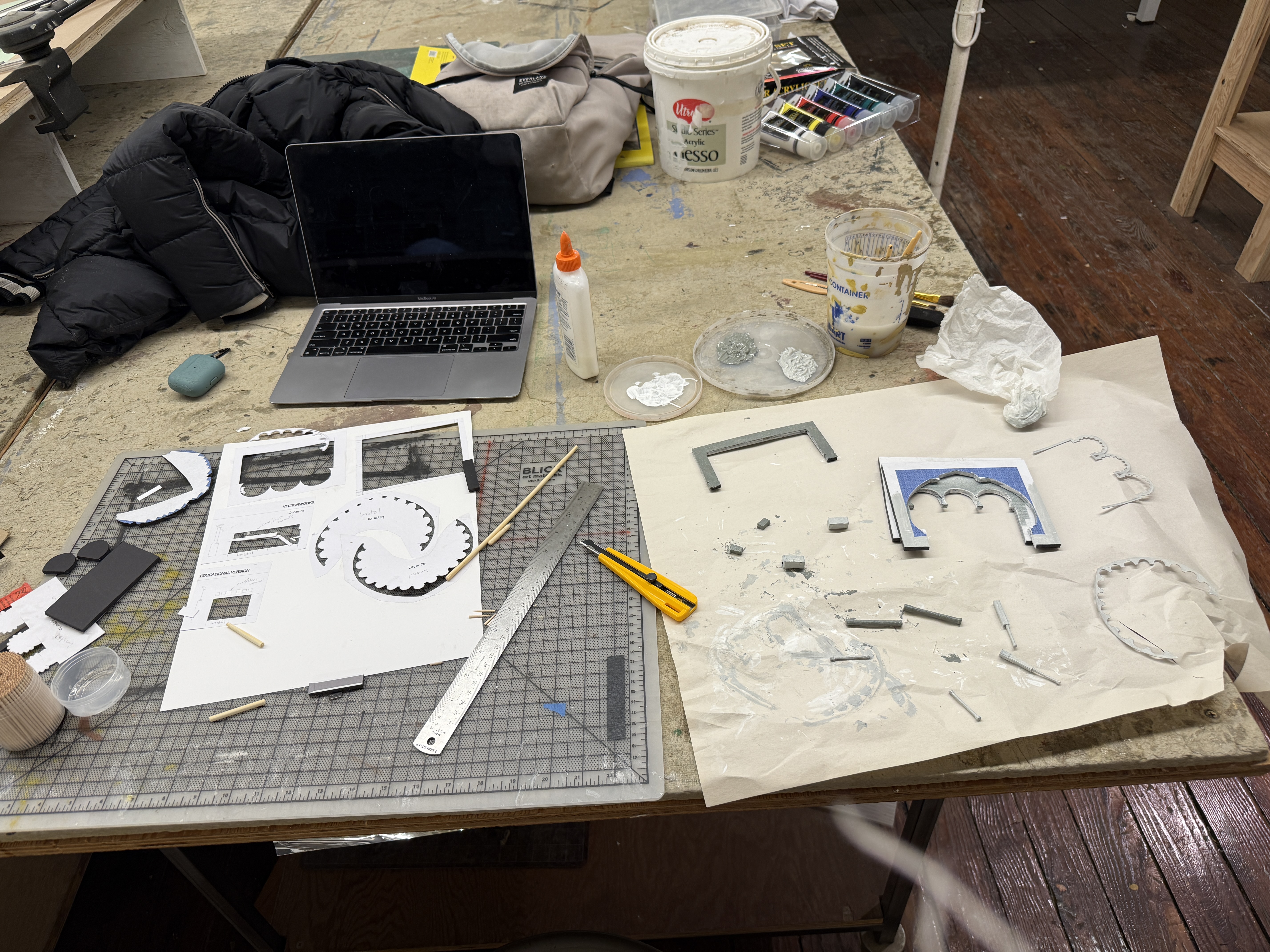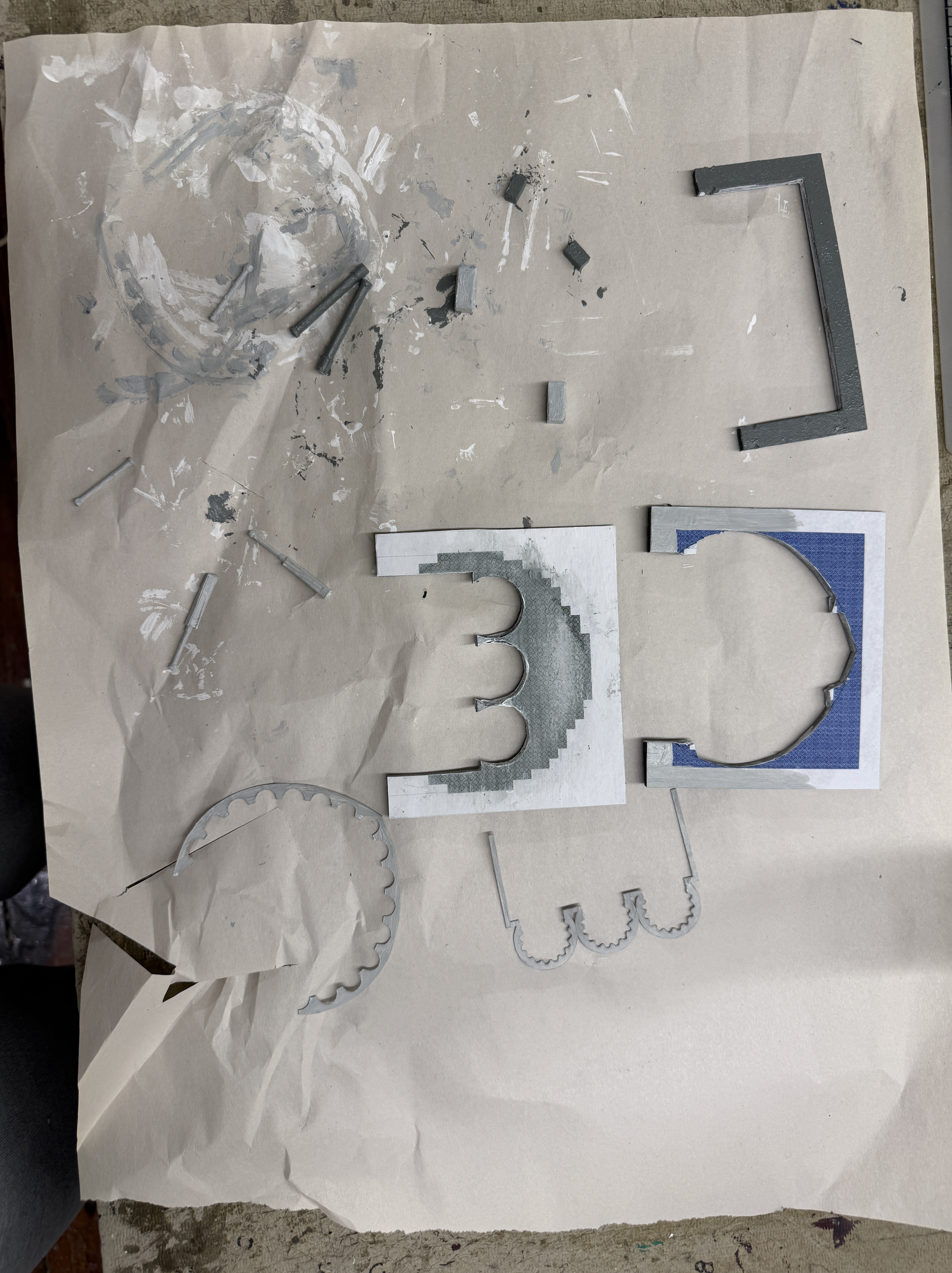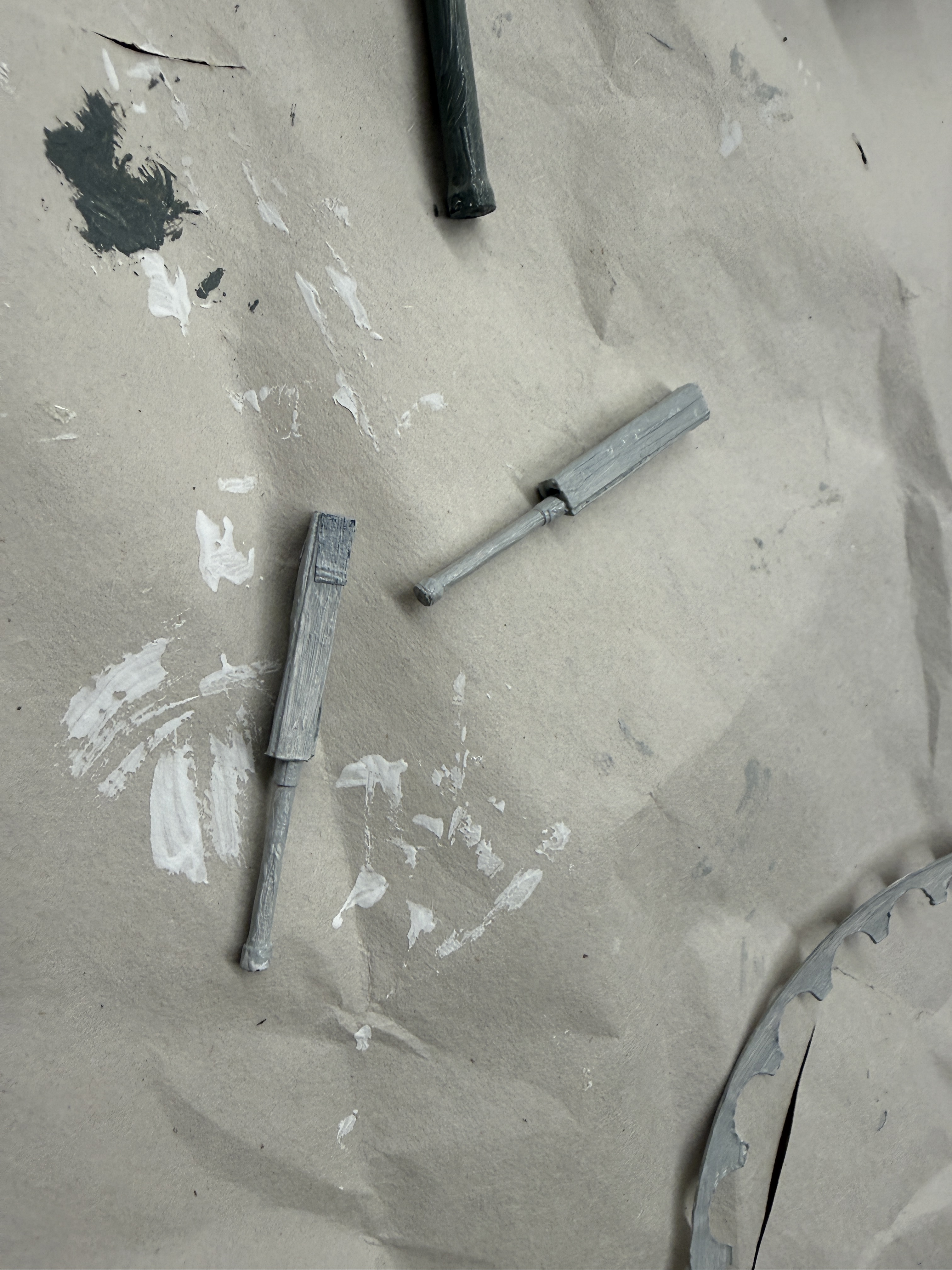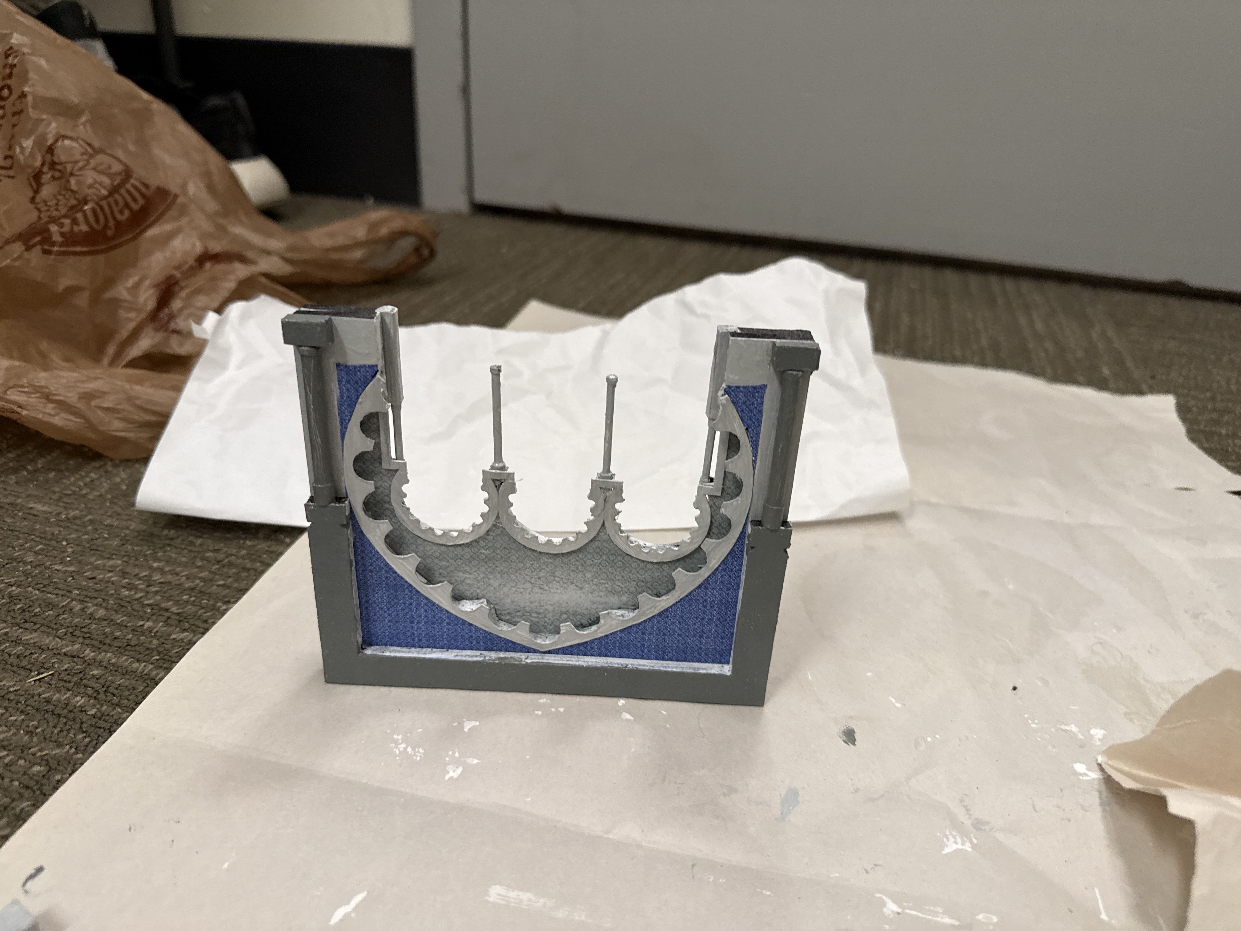 Additionally, I had a fun time making the columns. The smaller columns are toothpicks, and the larger ones chopsticks. I wrapped masking tape around the ends to create varying depth.