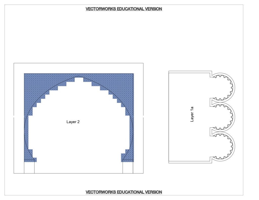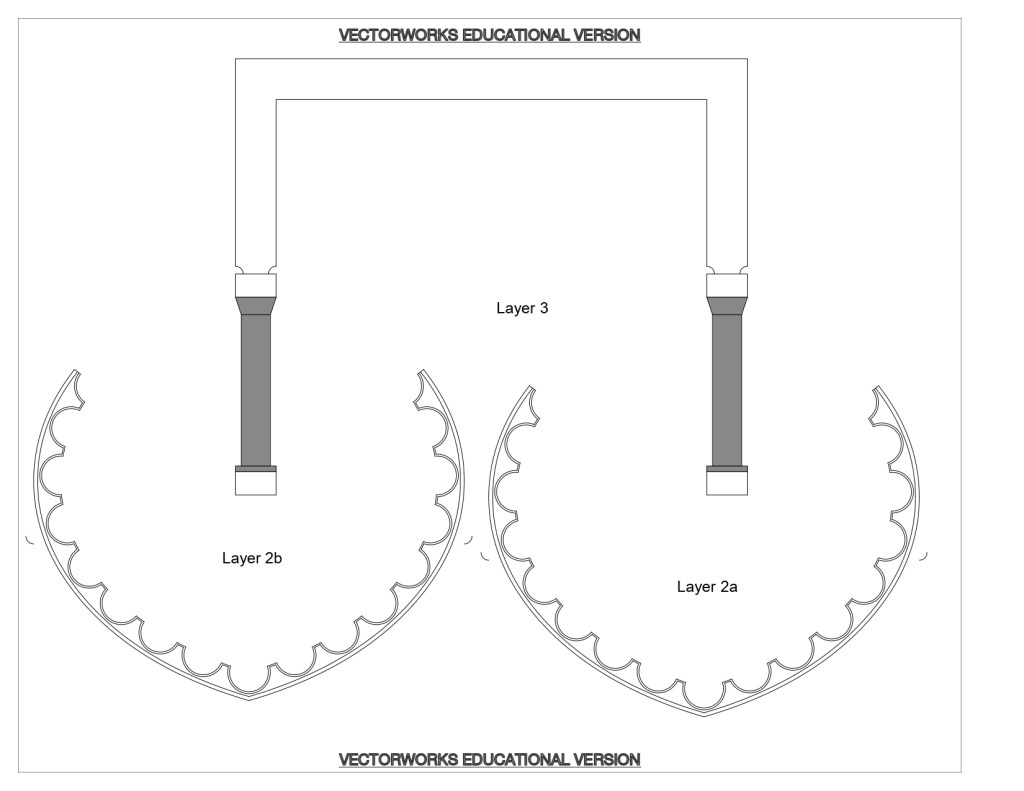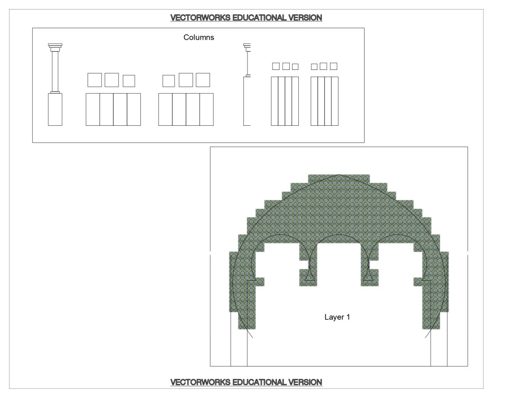 This was one of our first assignments using Vectorworks, so much of my time was spent figuring out how to draft it, and then how to draft it more efficiently. For example, I originally modelled the semi-circular cuts on the arches individually to practice, then I used the copy along path tool to re-model it more efficiently.